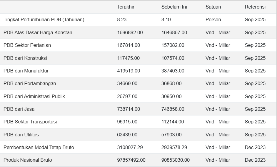 Di sisi lain, konsumsi domestik Vietnam juga menunjukkan geliat positif. Penjualan ritel naik 11,3% sepanjang September, dan indeks harga konsumen (IHK) tetap terkendali, hanya naik 3,38% pada September dibandingkan tahun sebelumnya. Seluruh sektor ekonomi menunjukkan kenaikan: industri dan konstruksi (9,46%), jasa (8,56%), serta pertanian (3,74%). Secara kumulatif, PDB Vietnam dalam sembilan bulan pertama tahun ini tumbuh 7,84%, terkuat sejak 2011. Pemerintah menargetkan pertumbuhan PDB sebesar 8,3%–8,5% sepanjang tahun 2025, angka ambisius yang jauh melampaui proyeksi Bank Dunia (6,6%) dan IMF (6,5%).