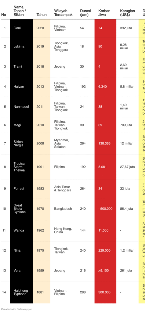 Super Topan Ragasa telah meninggalkan jejak kehancuran di Asia Timur — menewaskan belasan hingga puluhan orang, memaksa evakuasi massal, menutup pelabuhan dan transportasi, serta memicu kerusakan besar di infrastruktur dan lingkungan. Hong Kong, Taiwan, Tiongkok selatan, Filipina semuanya merasakan kedahsyatan badai ini.